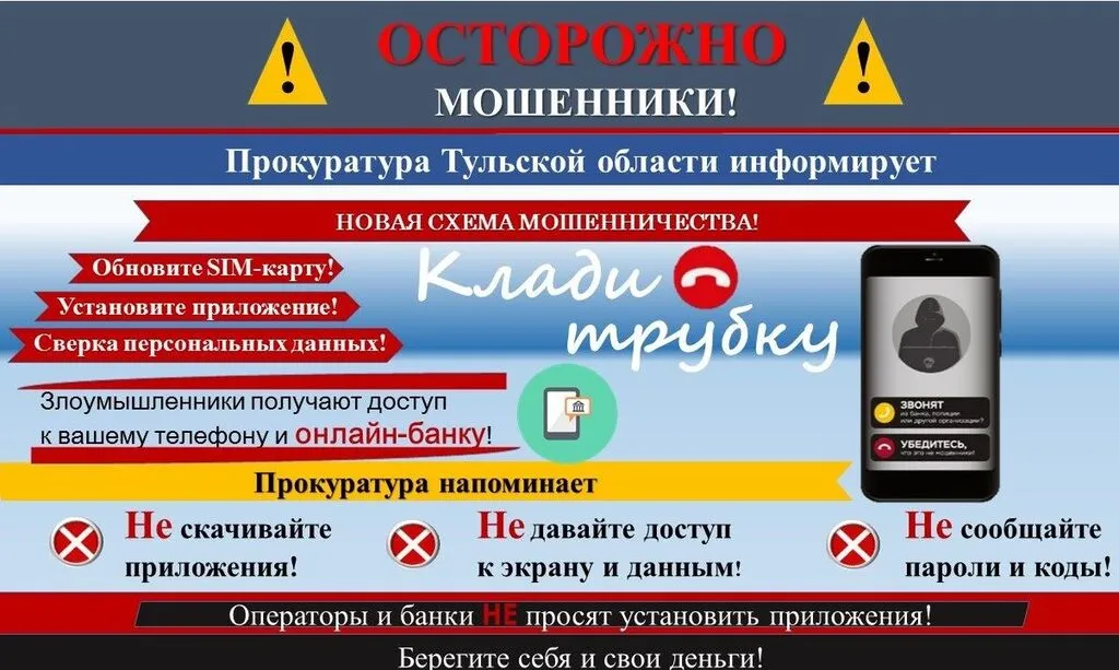 Если звонят с незнакомого номера и просят обновить СИМ-карту, установить приложение, необходимо выполнять простые правила, с которыми знакомят информационно-разъяснительные материалы, разработанные Прокуратурой Тульской области.