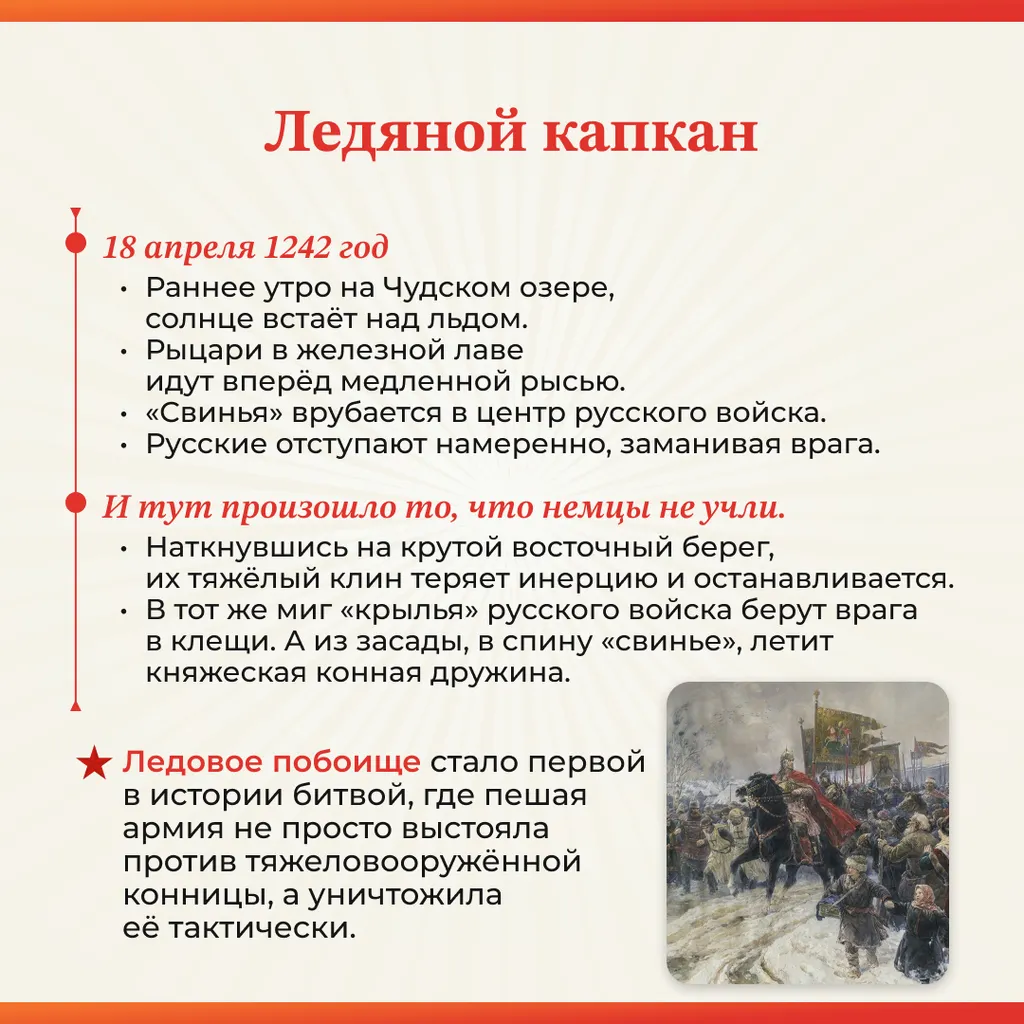 18 апреля 1242 год – День воинской славы России: День победы русских воинов князя Александра Невского над немецкими рыцарями на Чудском озере