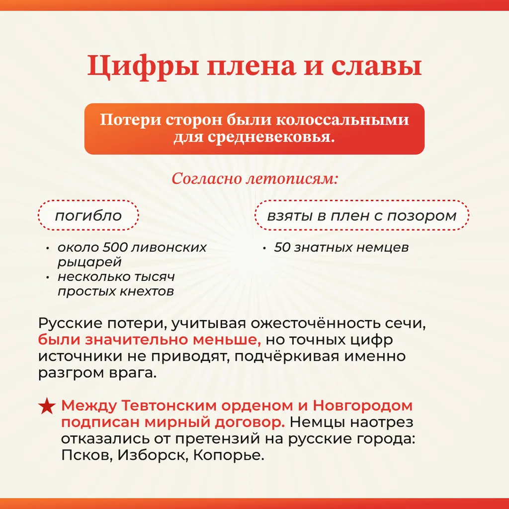 После поражения Ливонский орден был вынужден отказаться от претензий на Русь. Для русских земель победа стала символом единства и важным шагом в формировании централизованного государства.