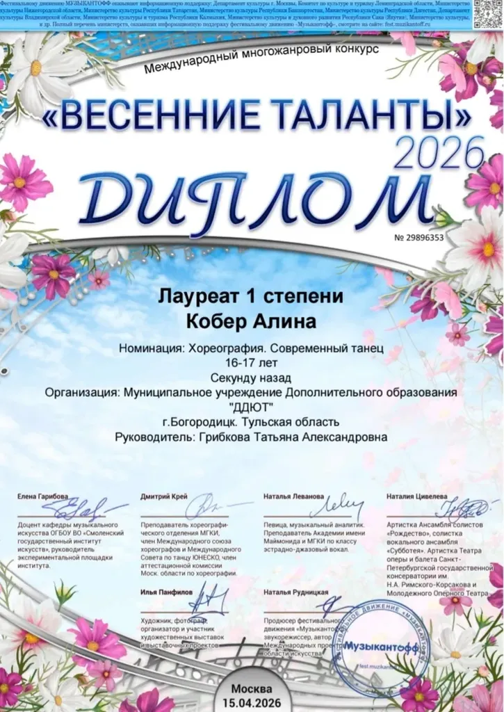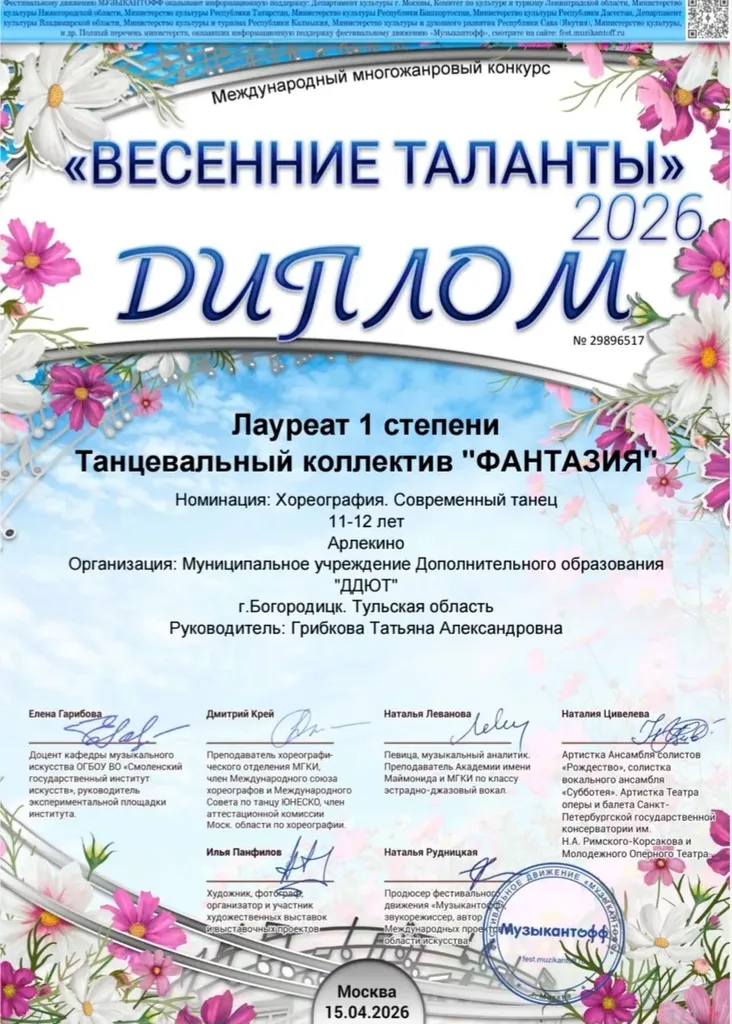 Поздравляем танцевальный коллектив «Фантазия» и руководителя Татьяну Александровну Грибкову с заслуженными наградами на международном конкурсе «ВЕСЕННИЕ ТАЛАНТЫ – 2026»!