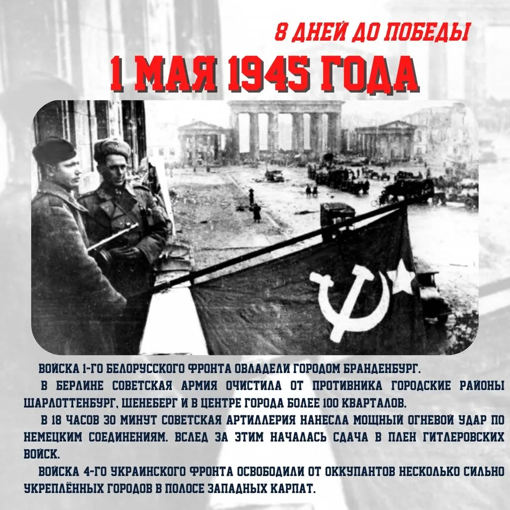 1 мая 1945 года советские войска штурмом заняли ряд немецких городов и населенных пунктов. В их числе – Бранденбург, мощный опорный пункт обороны немцев в центральной Германии.